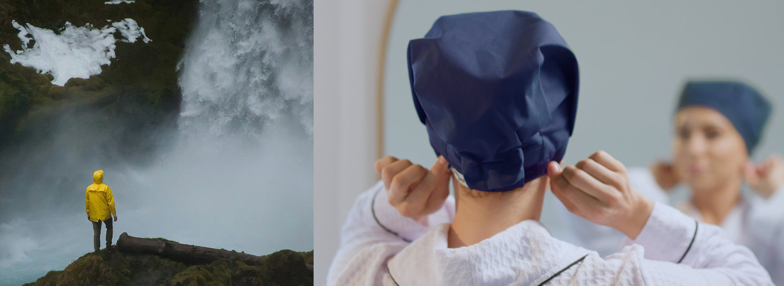 After designer brands make raincoats, we buy their fabric remnants for our patented, high performance shower caps.